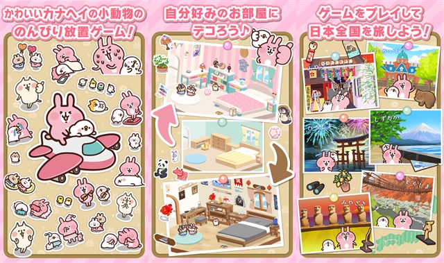 本作は、LINEスタンプやSNSで大人気のカナヘイさんのキャラクター【ピスケ&うさぎ】が大活躍するまったり旅行系放置ゲーム。ゲームはとっても簡単で、ピスケとうさぎを旅行に行かせて帰ってくるのを待つだけ。普段ゲームをしない誰でも、安心、お気軽に遊べる放置ゲームとなっている。