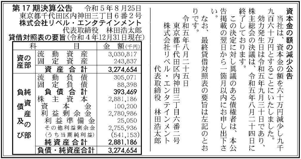 アエリア<3758>傘下のリベル・エンタテインメントが9月30日付けで減資を行う。本日(8月25日)付の「官報」に掲載された「資本金の額の減少公告」によると、資本金を60万円減らして9960万円にするとのこと。株主総会の決議は、8月24日に終了したという。
