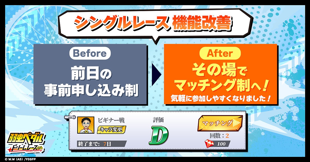 シングルレースの申請方法について、「前日に申請する」形式から、いつでもレース申請ができる「その場でマッチング」形式に変更した。また、1キャラクターにつき1日2回以上参加ができるようになり、参加可能キャラクター数の制限も撤廃した。今回の改善により、シングルレースへの参加がしやすくなる。