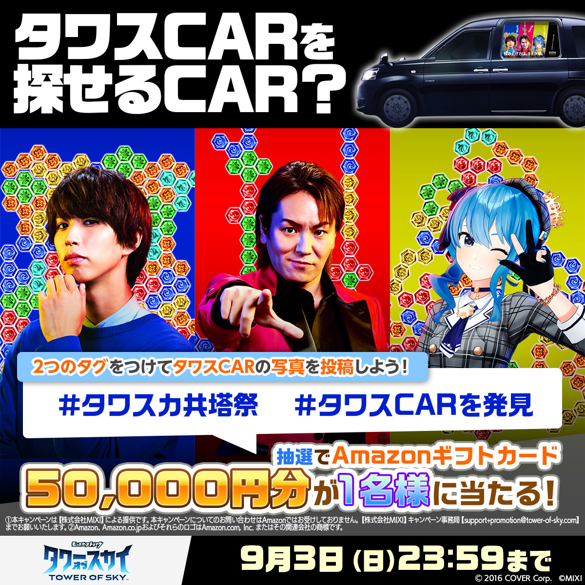 さらに「タワスCAR」の走行に伴うキャンペーン「タワスCARを探せるCAR?キャンペーン」では、タワスカ公式X(旧Twitter)アカウントをフォローし、「タワスCAR」を撮影、「#タワスカ共塔祭」「#タワスCARを発見」をつけて自身のX(旧Twitter)アカウントで投稿すると抽選で1名にAmazonギフトカード5万円分を贈呈する。