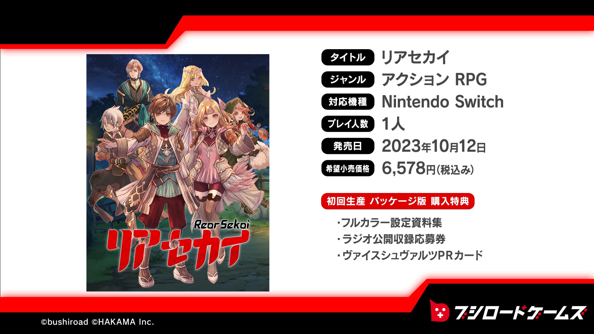 ブシロードが贈るオリジナルタイトル第1弾『リアセカイ』は、プロデューサーにはしもとよしふみ氏を迎え制作する完全新作アクションRPG!そして、メインイラストに七原しえ氏・岩崎美奈子氏、メイン楽曲に桜庭統氏、主題歌に亜咲花氏と豪華クリエイター陣でお届け!