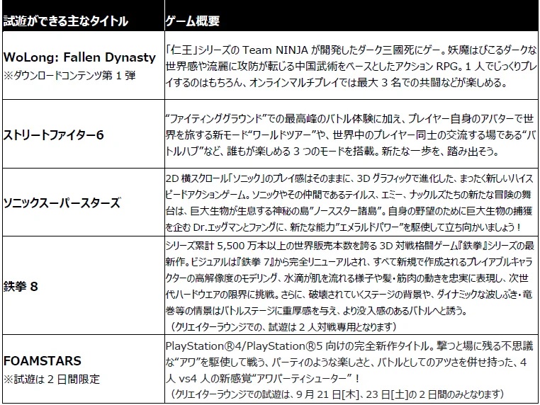 「クリエイターラウンジ supported by YouTube Gaming」 試遊・配信可能な主なタイトル(9月4日現在)