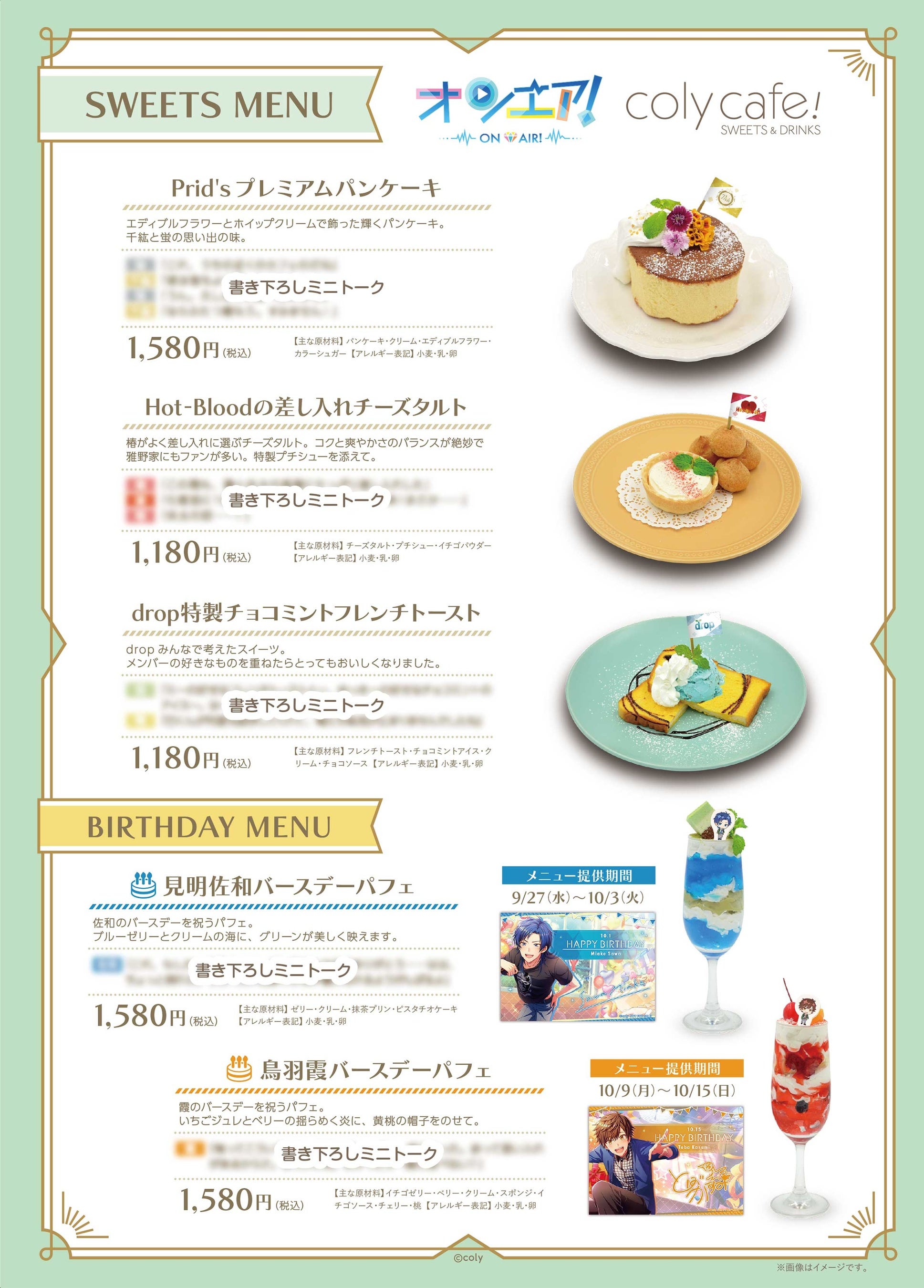 コラボ開催期間中、『coly cafe! 池袋PARCO店』では『オンエア!』に登場するフードやデザート、各ユニットをイメージしたドリンク、見明佐和と鳥羽霞のバースデーパフェを販売予定です。