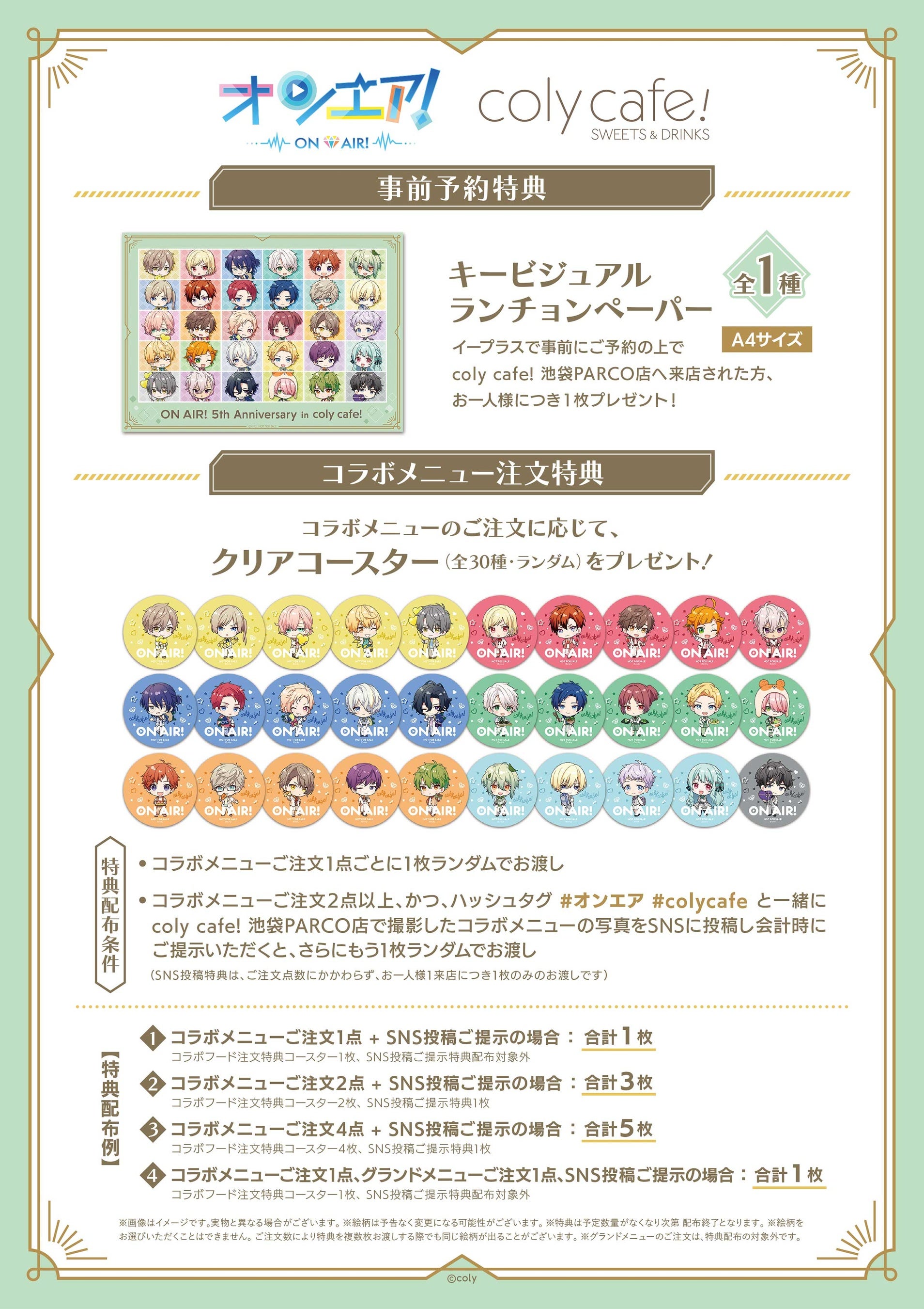 コラボメニューを2点以上、かつ、ハッシュタグ #オンエア #colycafe と一緒に『coly cafe! 池袋PARCO店』で撮影した『オンエア!』コラボメニューの写真をSNSに投稿し、会計時にご提示いただくと、さらにもう1枚、クリアコースター(全30種)をランダムでプレゼントいたします。