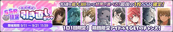 1日1回限定で引くことができる「有償限定 SSR確定引き直しガシャ」を開催中。【期間限定アイドル】を含むガシャとなっており、1度の購入で10連を最大3回引いて結果を1つ選ぶことができる。それぞれ10連の最後の1枚は、SSRアイドルが確定で登場する。