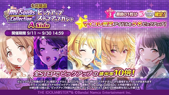 全STEPでピックアップ対象のアイドルの排出率10倍。どちらもマイソングスコレクション限定アイドルを5名ピックアップしており、STEP3の最後の1枚にSSRプロデュースアイドルが確定で登場する。