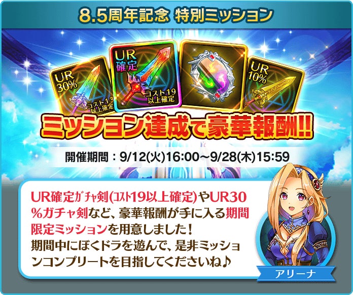 開催期間中に挑戦できる期間限定ミッションが登場します。限定ミッションをクリアしていくことで即戦力オーブを狙いやすい「UR確定ガチャ剣(コスト19以上確定)」や「UR30%ガチャ剣」など、8.5周年を記念した豪華な報酬を獲得できます。