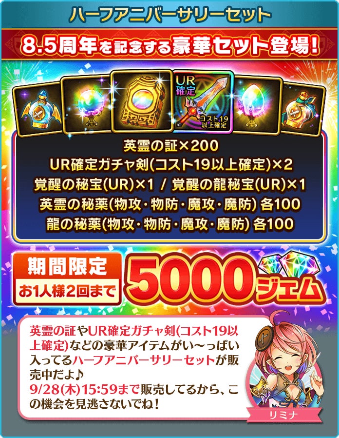 豪華アイテムをまとめて獲得できる記念セットをご用意いたしました。8.5周年を記念したお1人様2回限りの非常にお得なセットとなっております。