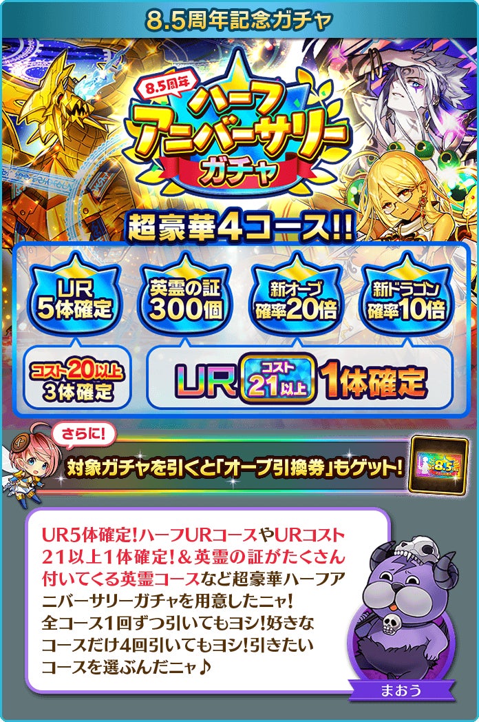 さらに対象のガチャを引くと高コストURユニットや豪華アイテムなどがもらえる「ハーフアニバーサリーくじ」に加え、好きなコスト20~21オーブ(限定を除く)と交換できる 「8.5周年記念!オーブ引換券」がおまけで付いてくるお得なガチャとなります。