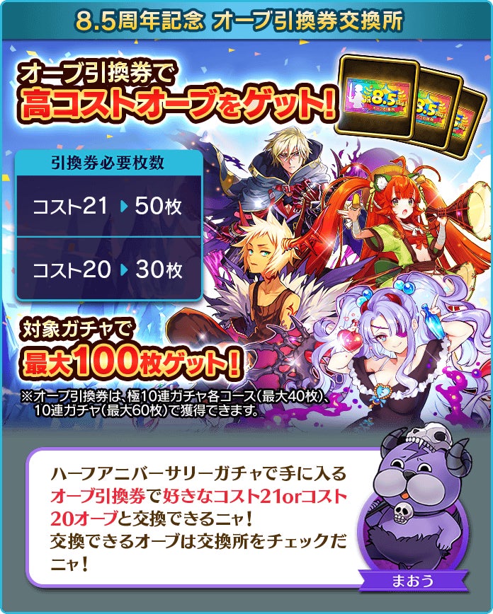 「ハーフアニバーサリーガチャ」で獲得できる「8.5周年記念!オーブ引換券」を集めることで、「8.5周年記念オーブ引換券交換所」にて2023年9月12日(火)までに登場したコスト20~21までの好きなオーブと交換することができます。(限定を除く)