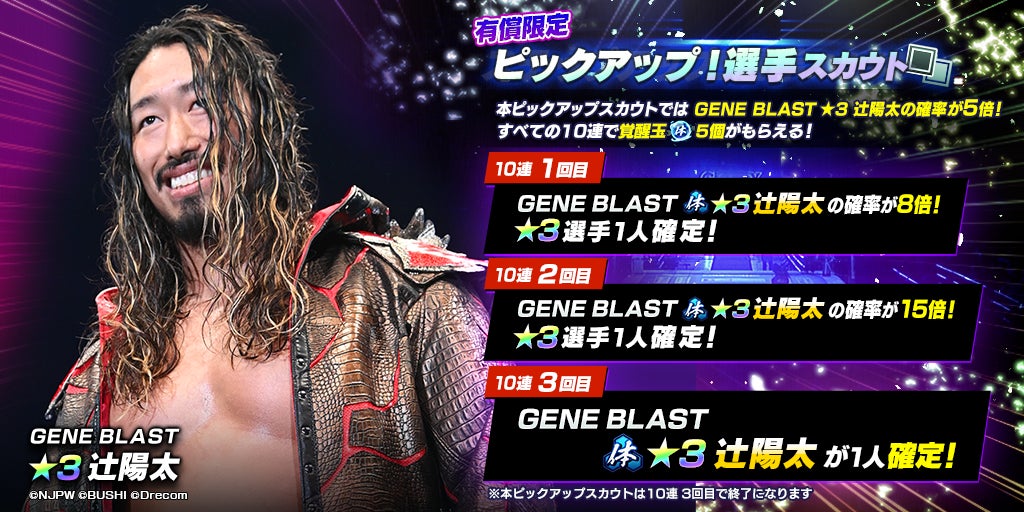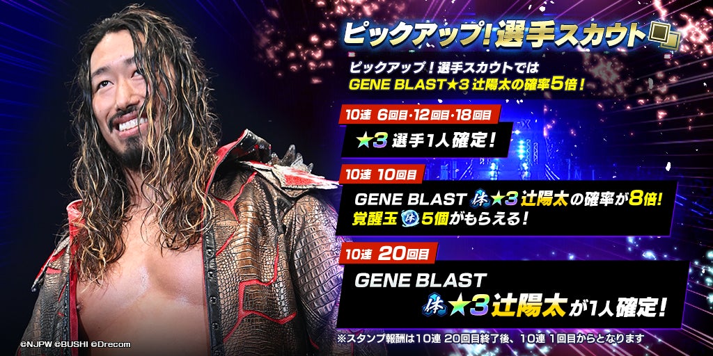 新日SSは2023年9月13日(水)メンテナンス終了後から、★3「[GENE BLAST]辻陽太」が登場する「ピックアップ!選手スカウト」を開催しました。本スカウトにて、10連スカウトを既定回数行うと、ラインナップに含まれる★3選手からいずれか1人を確定で獲得できる仕様となります。また、今回初登場する★3「[GENE BLAST]辻陽太」は、ピックアップ対象として、スカウト確率が通常の5倍となっています。