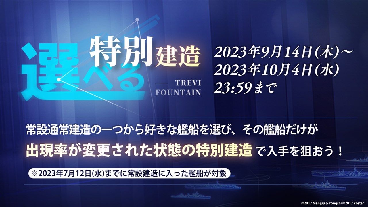 常設三種類の通常建造から一つをベースに特定の艦船を2種類選択し、その艦船の出現率が変更された状態になる特殊な建造システムになる。「出現率変更」に選ばれた艦船の出現率はレアリティに応じて異なり、下記の通り。
