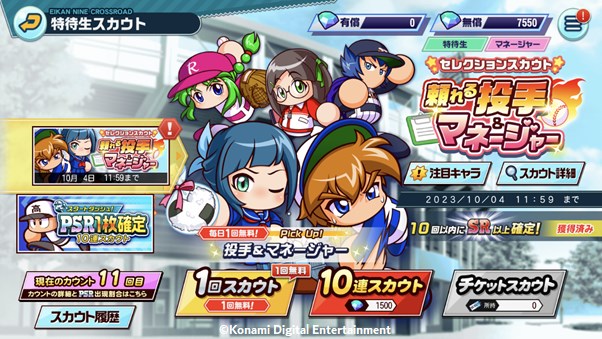 10連スカウトのほか、1日1回無料でガチャを回すことができ、特待生の「〔PSR〕猪狩 守」やマネージャーの「〔PSR〕津乃田 梨亜」などが獲得できる。強力なキャラをゲットして、野球部を補強しよう!