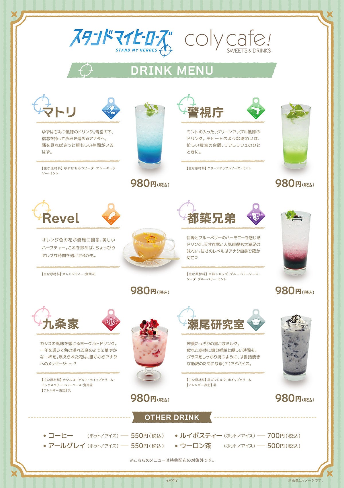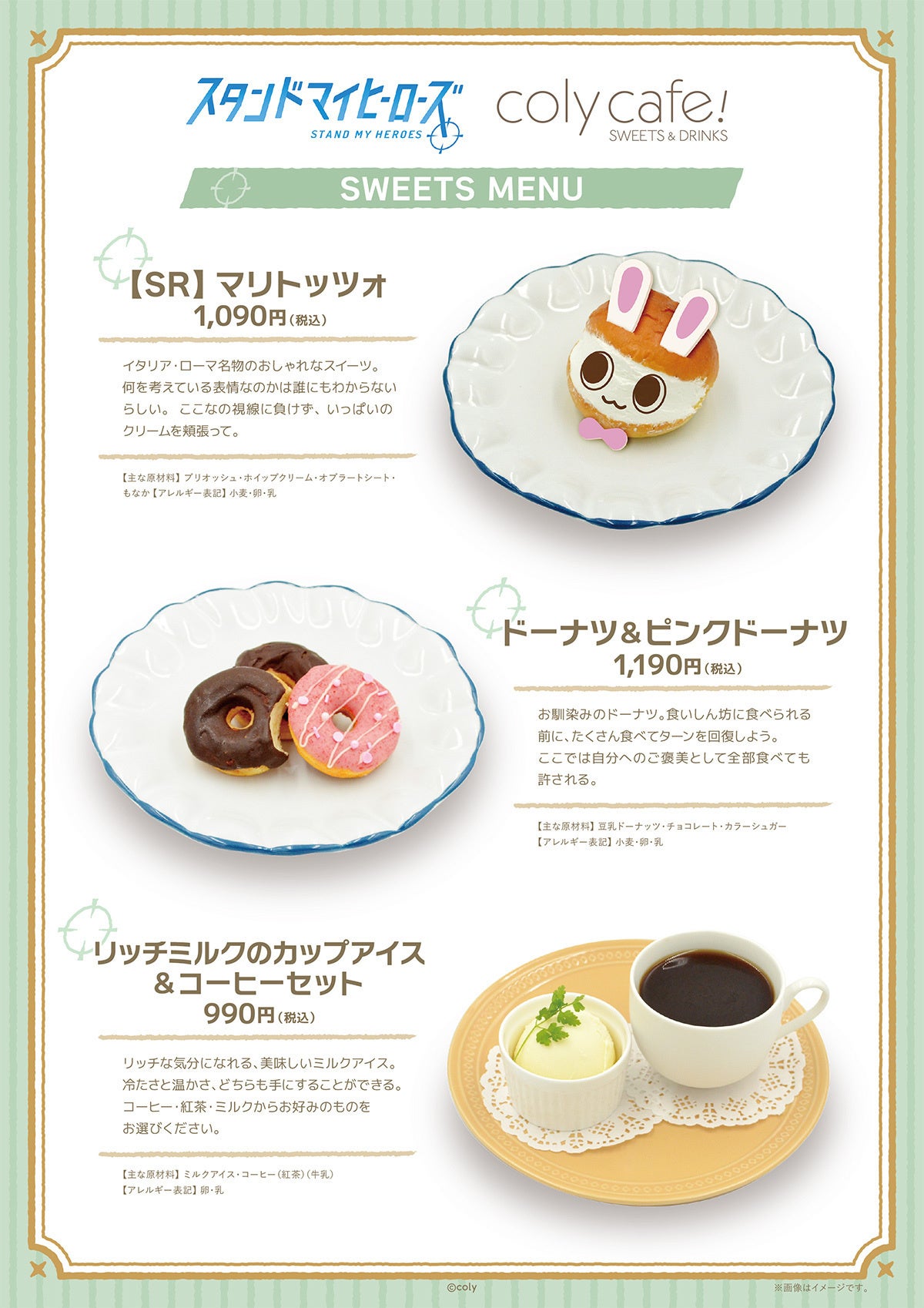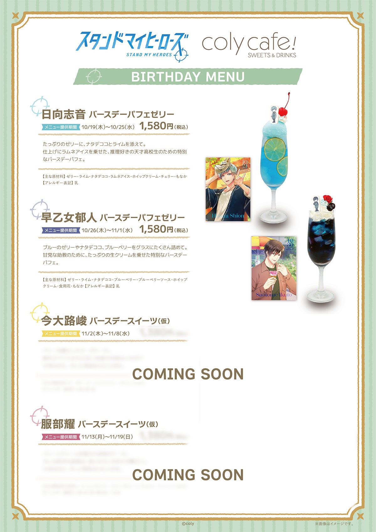コラボ開催期間中、『coly cafe! 池袋PARCO店』では『スタンドマイヒーローズ』に登場するフードやデザート、各所属をイメージしたドリンク、日向志音・早乙女郁人・今大路峻・服部耀のバースデーメニューを販売予定です。
