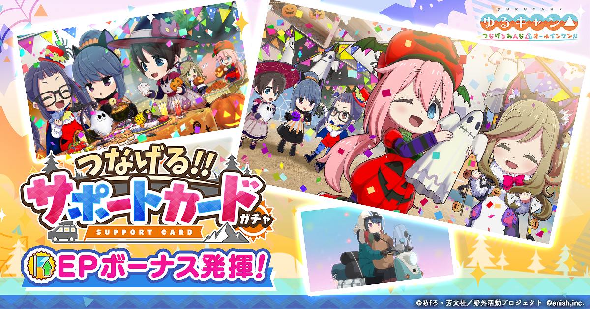 ストキャン「みんな集まれ! ハロウィンパーティーの招待状」のオリジナルカードや、アニメ『ゆるキャン△』の印象的なシーンを使用したカードが手に入る、新しいサポートカードガチャを期間限定で開催する。