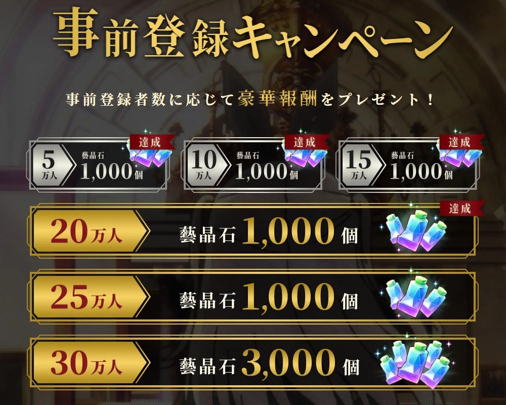 事前登録者数20万人を達成したことにより、サービス開始時に「藝晶石」4,000個(ガチャ13回分)の全員プレゼントが決定した。引き続き、お気に入りのキャラクターが選べる「事前登録ガチャ」や、回したガチャの回数に応じて豪華報酬がもらえる「事前登録ミュージアム」も開催中なので毎日事前登録サイトを訪ねてみよう!