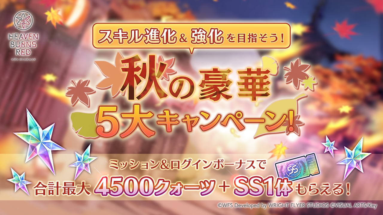 「スキル進化&強化を目指そう!秋の豪華5大キャンペーン!」を開催中!2つの豪華ログインボーナスや期間限定ミッションをクリアすると、合計最大で4,500クォーツ+SS1体が獲得できる。さらに、なんと「異時層」が一週間に2回出現!初の「異時層祭り」も登場している。