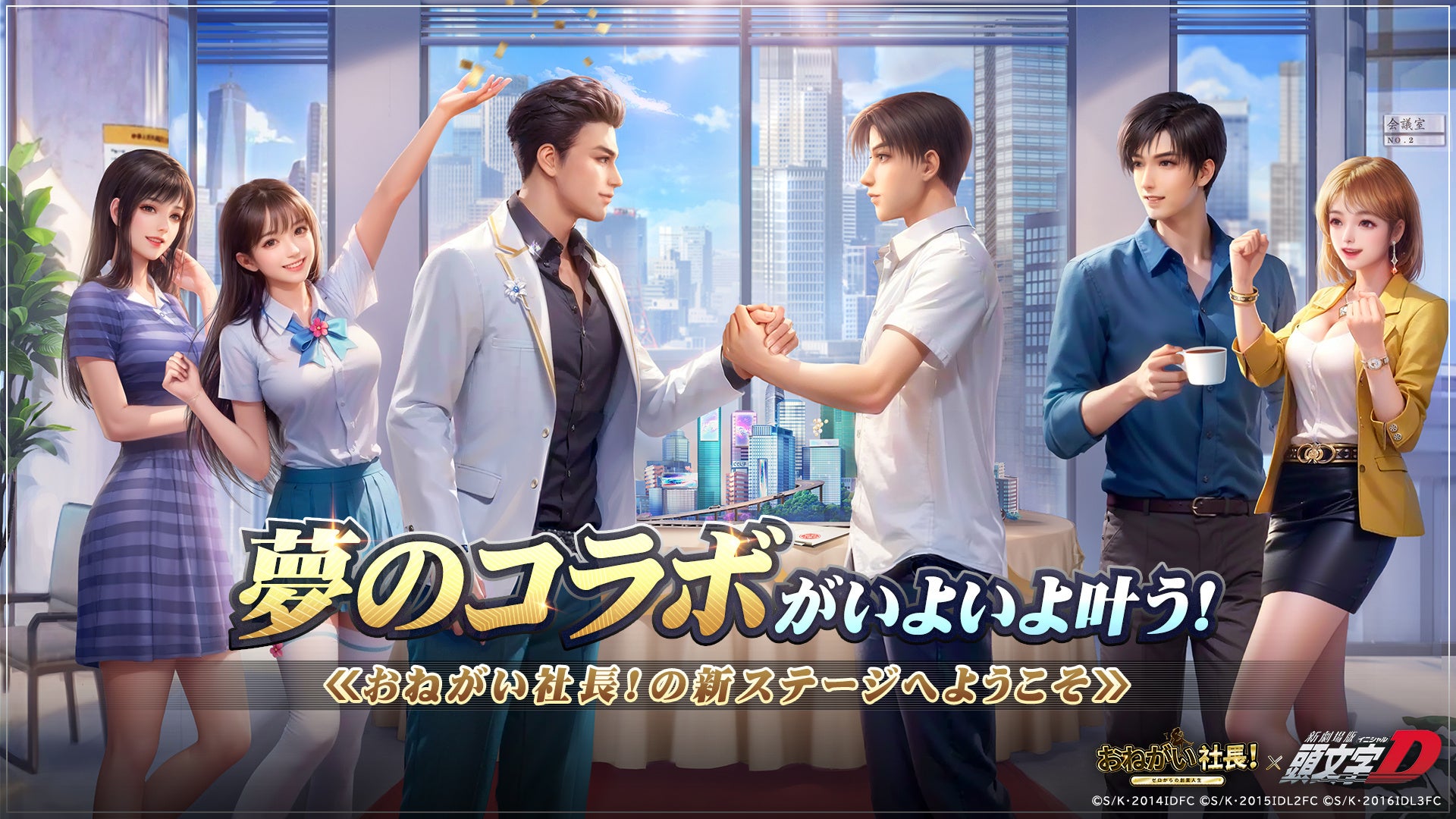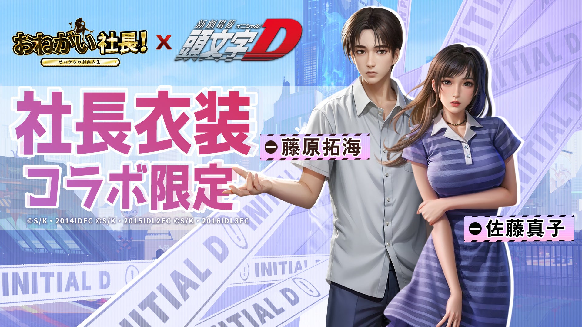 北関東の名立たる峠道を舞台に、主人公・藤原拓海が高橋兄弟とともに“公道最速”を目指す姿を描く。「頭文字D」と運命を塗り替えながら、人生の勝者を目指していく会社経営育成シミュレーションゲーム「おねがい社長!」の夢のコラボ。伝説が動き出します!