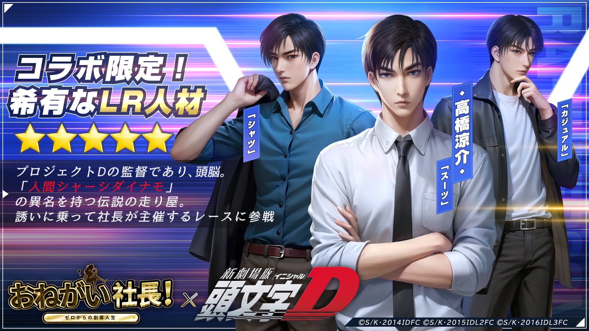 赤城レッドサンズのリーダー、高橋涼介がLR人材として「おねがい社長!」の世界に登場!高橋涼介をゲットできる期間限定イベント「イニDコラボ」が開催中!また、新たな人材衣装「シャツ・スーツ・カジュアル」の3パターンも追加します!