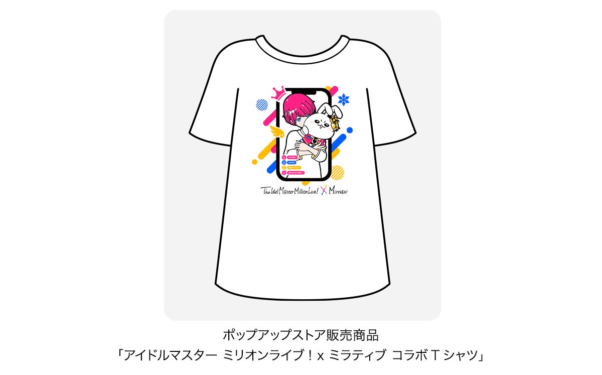 ポップアップストアでは、描き起こしイラストのアイテム、ミリオンスターズ全員のトレーディング缶バッジ、本コラボを記念して制作された「アイドルマスター ミリオンライブ! × ミラティブ コラボTシャツ」を販売予定。