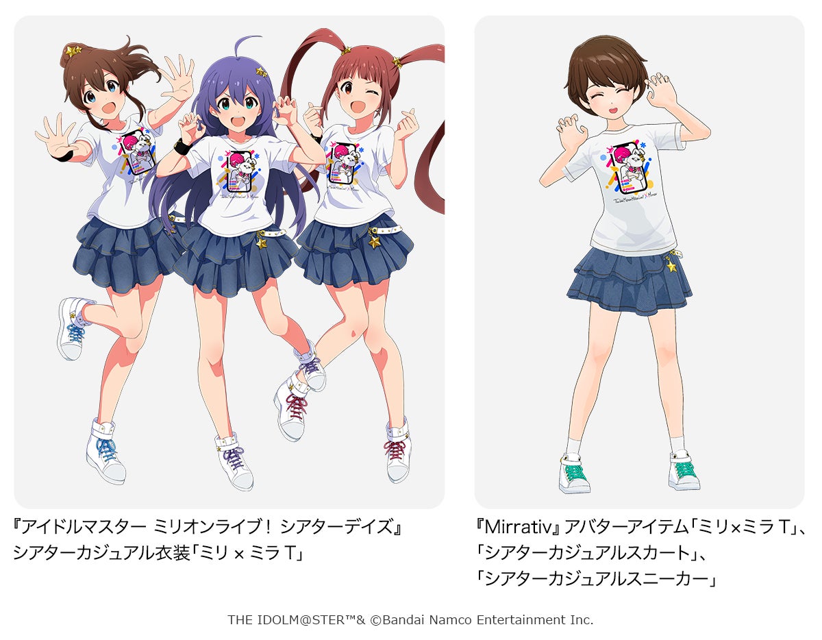 「ミリ×ミラT」は、『アイドルマスター ミリオンライブ! シアターデイズ』でもカジュアル衣装として楽しむことができます。詳しくは『アイドルマスター ミリオンライブ! シアターデイズ』内をご確認ください。