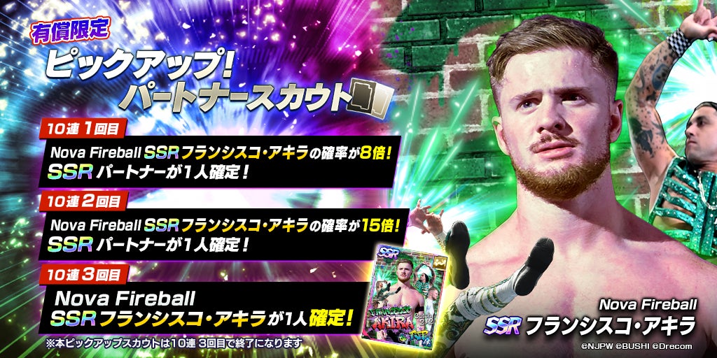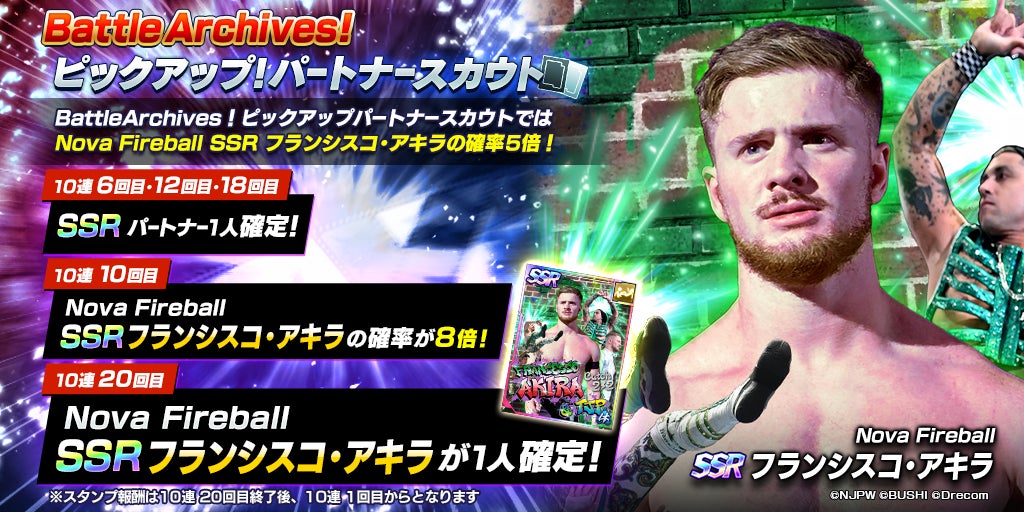 新日SSは2023年10月4日(水)メンテナンス終了後から、SSR「[Nova Fireball]フランシスコ・アキラ」が登場する「Battle Archives!ピックアップ!パートナースカウト」を開催。本スカウトは10連スカウトを既定回数行うと、ラインナップに含まれるSSRパートナーからいずれか1人を確定で獲得できる仕様となる。また、今回初登場するSSR「[Nova Fireball]フランシスコ・アキラ」は、ピックアップ対象として、スカウト確率が通常の5倍となっている。