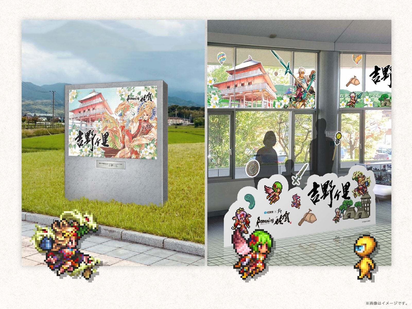 JR吉野ケ里(駅に関連するのは吉野“ケ”里らしい)歴史公園駅に隣接するコミュニティーホールが、期間限定でロマ佐賀仕様にアップグレード。ウインドウラッピングやエントランスの柱ラッピングに加え、スクウェア・エニックス社寄贈の特製待合ベンチやフォトパネル、冒険者のメッセージボードなども設置予定です。