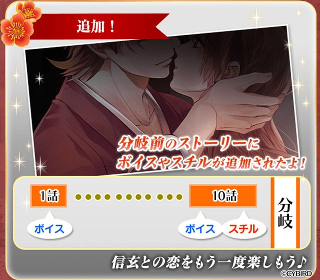 ・「武田信玄」本編の1話と10話のストーリーに新たにボイスやスチルが追加されています。もう一度1話から信玄本編を読む方にもよりリッチにお楽しみいただけます。
