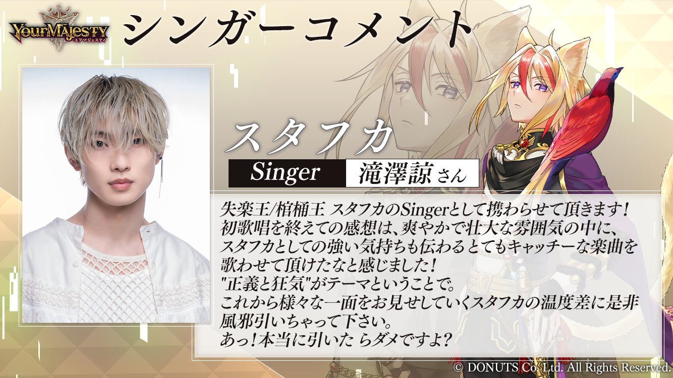 DONUTSが運営するメディアミックスプロジェクト「正義」と「狂気」の物語『ユアマジェスティ』は、【失楽王/棺桶王 スタフカ】[CV:宮崎遊]の新シンガーとして、劇団四季『ライオンキング』 ヤングシンバ役でデビューし、現在は2.5次元舞台を中心に活躍する人気俳優の滝澤諒を新たに起用することを発表した。