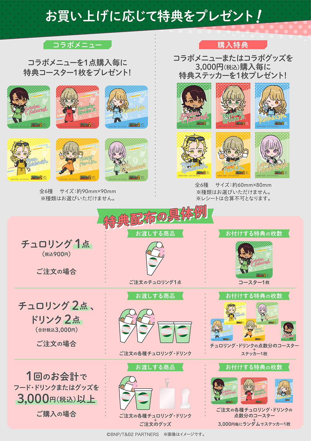・コラボメニュー1点購入毎に特典コースター(全6種)を1枚ランダムでプレゼントする。