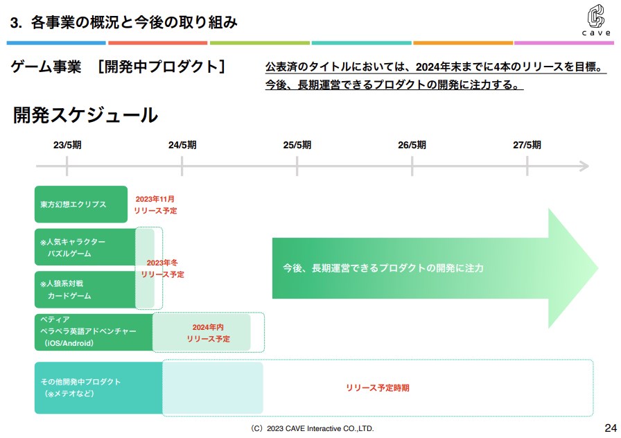 同社は、公表済のタイトルについては、2024年末までに4本のリリースを目標としている。今後、長期運営できるプロダクトの開発に注力する、としている。