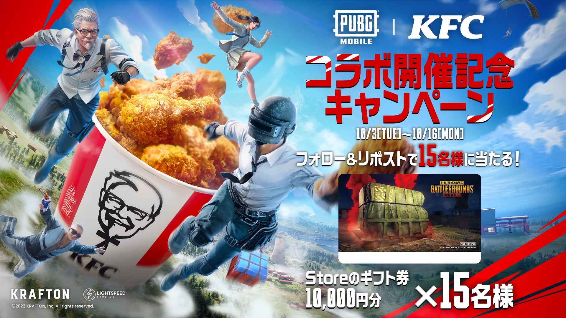 KFCとのコラボレーションを記念してフォロー&リポストキャンペーンを開催中です。@PUBGMOBILE_JPをフォローしてキャンペーンポストをリポストしていただいた方の中から抽選で15名様にStoreギフトカード1万円分(Apple/Google)をプレゼントいたします。