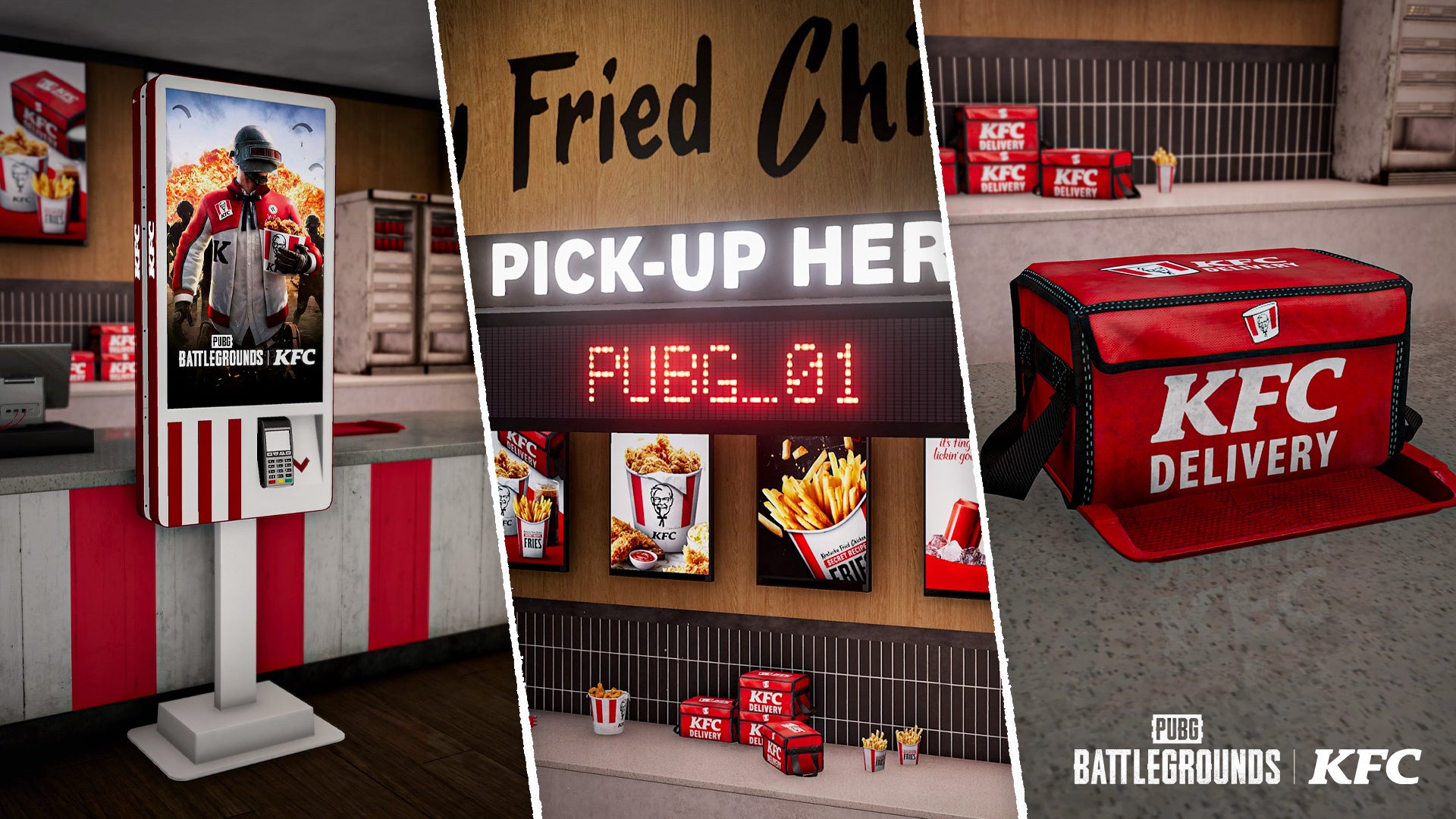 KFC店舗に一番乗りしてキオスクを使用して注文したすべてのプレイヤーにKFCロゴスプレーアイテムを獲得できるゲーム内イベントです。マッチ毎に挑戦できるイベントとなっておりますので何度も挑戦してみてください。Erangelのマップ内10箇所にあるKFC店舗のどの店舗でも対象となります。