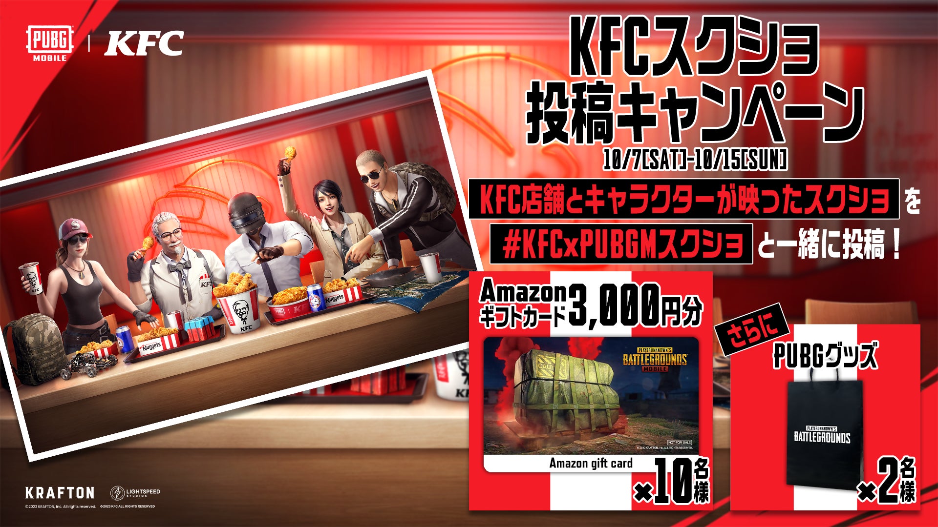 KFC店舗が登場しているマップでKFC店舗とキャラクターが映った様子を撮影し、ハッシュタグ(#KFCxPUBGMスクショ)をつけて投稿していただいた方の中から抽選で10名様にAmazon Gift Card 3,000円分、更に2名様にPUBGグッズをプレゼントいたします。