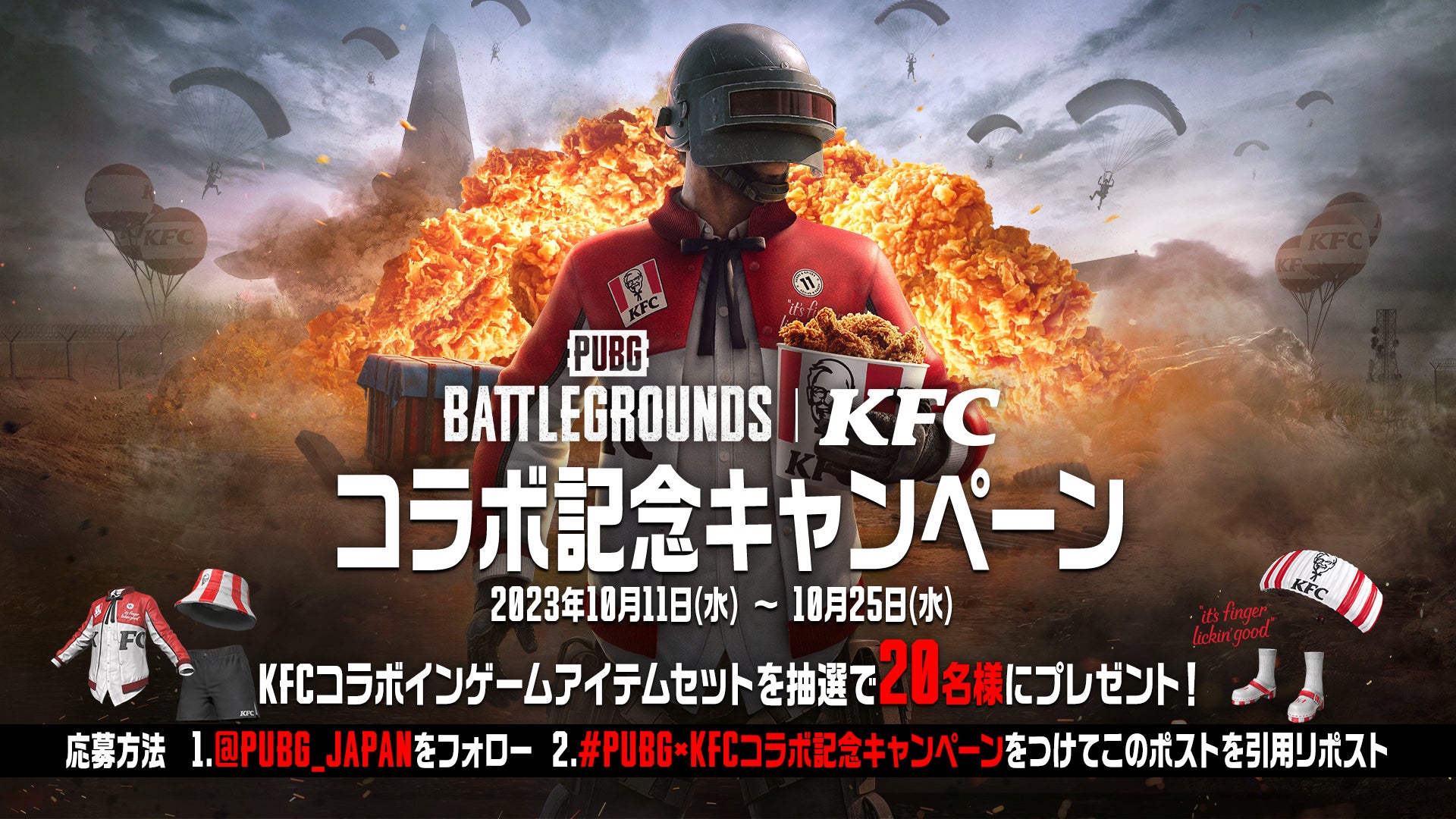@PUBG_JAPANをフォローしてキャンペーンポストにハッシュタグ(#PUBGxKFCコラボ記念キャンペーン)をつけて引用リポストしていただいた方の中から抽選で20名様にKFCコラボゲーム内アイテムセットをプレゼントいたします。