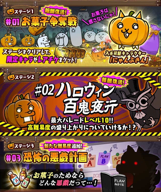 ハロウィン限定の期間限定ステージを開催。「#01 お菓子争奪戦」はクリアで限定キャラクター「にゃんぷきん」が極めてまれな確率で手に入る。