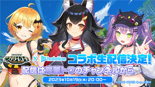 本コラボでは、ホロライブの「夜空メル」「大神ミオ」「常闇トワ」がガチャに新登場する。また、本日10月18日より、録りおろしボイスを収録したコラボ紹介PVを公開する。さらに、コラボ開催を記念して「ホロライブ」コラボメンバーの好物や趣味に関する賞品が当たる「ホロの宝ものクジ」を開催。そのほか、10月19日20:00 より「夜空メル」「大神ミオ」「常闇トワ」の3名が生配信を実施する。