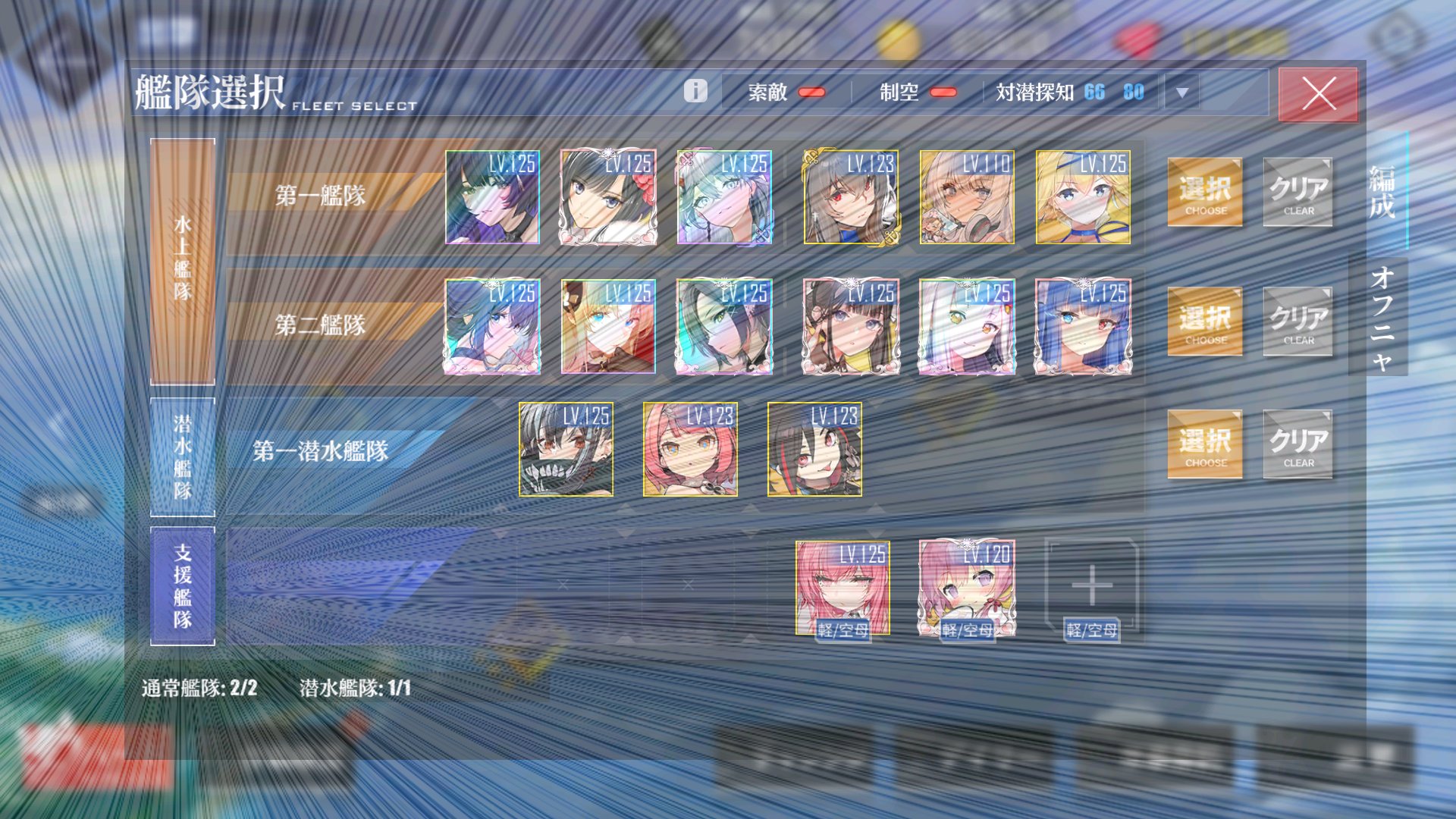 「支援艦隊」を編成する艦船は燃料を消費せず、コンディションも低下しない。すでに水上艦隊に編成されている空母/軽空母は支援艦隊に編成できない。支援艦隊の編成によって自動迎撃する戦闘機が変化する。