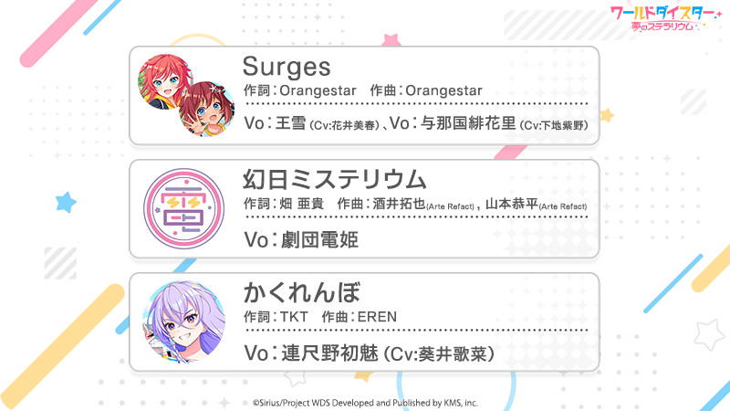 10月19日にカバー楽曲「Surges」を追加した。さらに11月は「幻日ミステリウム」と「かくれんぼ」の追加を予定している。