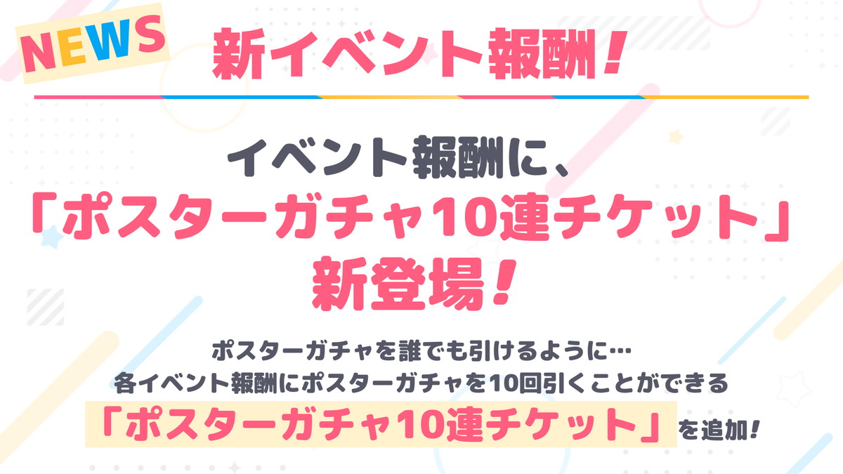 新イベント「マジカルガール☆ハロウィン」より新たに「ポスターガチャ10連チケット」をイベント報酬に追加する。そのイベントのポスターガチャを10連分引くことのできるチケットになるので、是非イベントに参加してほしい。
