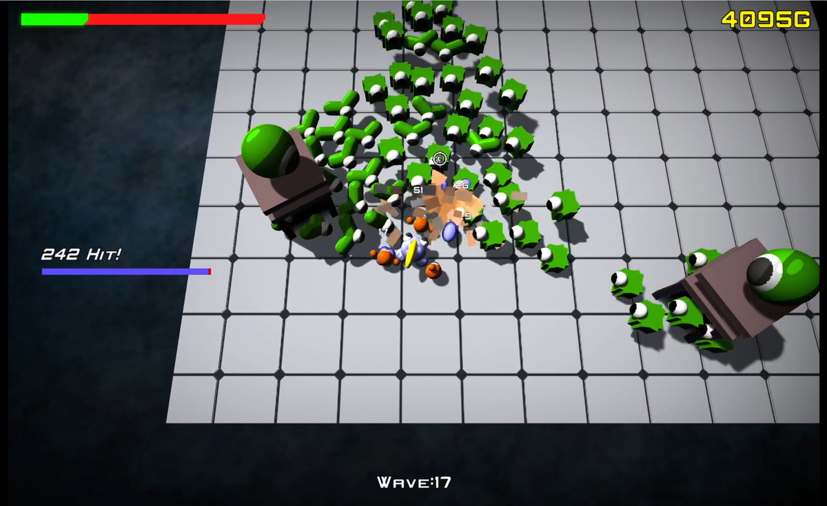 フィールドにスポーンするタワーから無限に湧き出る、不気味だけどちょっと可愛いエイリアンから身を守りクリアを目指す。