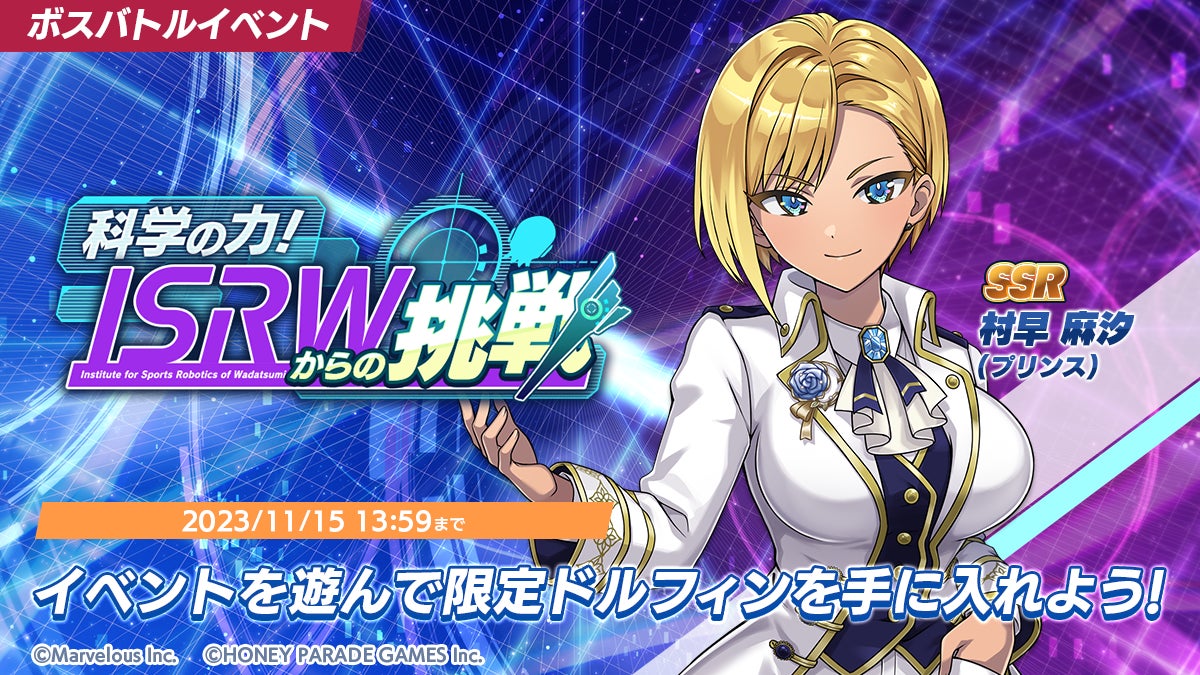 2023年10月20日より、ボスバトルイベント「科学の力!ISRWからの挑戦」を開催しました!ボスバトルに登場する期間限定ボスを撃破して、「ボスメダル(ISRWからの挑戦)」や「ボスメダル(ISRWからの挑戦)DX」を集めましょう。集めた「ボスメダル(ISRWからの挑戦)」「ボスメダル(ISRWからの挑戦)DX」は、専用のショップでイベント限定SSRドルフィンやドルフィン強化素材等、様々な報酬と交換することができます。たくさんメダルを集めて、報酬を獲得しましょう!