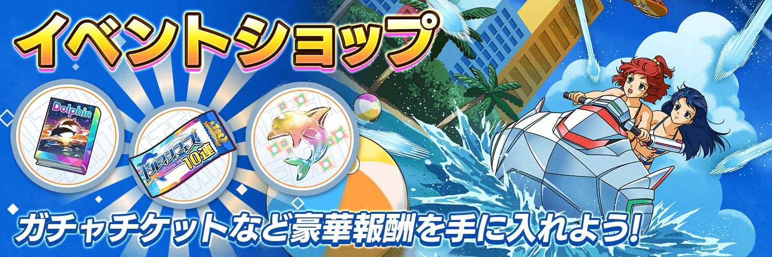 2023年10月20日よりミニゲーム「ドルフィン パーティー」を復刻リリースいたしました!今回は1stアニバーサリー記念として、イベントショップでの交換報酬にドルフィンフェスAllegroやドルフィンフェスAndanteで使用できる「ドルフィンフェス10連ガチャチケット」が登場!毎日遊んで豪華報酬を手に入れましょう!