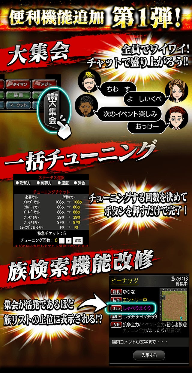 「一括チューニング」機能の追加で、チューニングが楽になり魂の解放が簡単に!さらに、プレイヤー同士が気軽に話せる「大集会」などの機能を順次追加します!