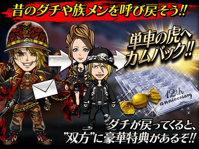 DONUTSが運営するリアルタイム暴走族バトルゲーム『暴走列伝 単車の虎』は、リリース以来、ヤンキーゲームを代表する長期人気タイトルとして多くのユーザーに支持され続けている。今年の12周年を記念して、超貴重なアバターや記念バイク等が手に入る「12周年ガチャ」や、過去に本ゲームで遊んでいたプレイヤーに「お誘い」のメッセージを送ってカムバックすると互いに報酬がもらえる「12周年記念!!カムバックキャンペーン」など、豪華7大キャンペーンを開催する。