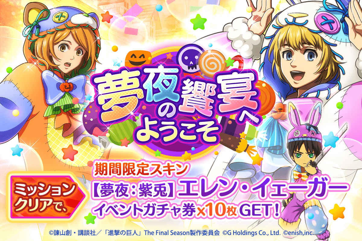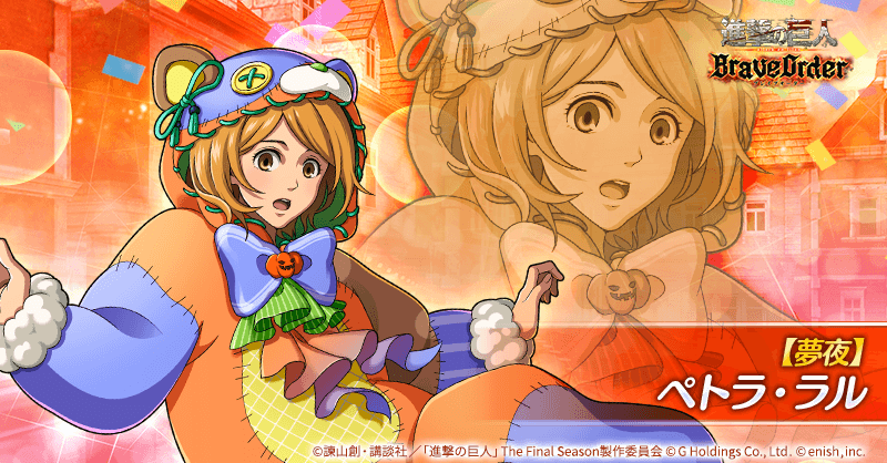 enish<3667>は、「進撃の巨人Brave Order」において、10月24日(火)より、新イベント「夢夜の饗宴へようこそ」を開始した。イベントアイテムを集めてイベント限定おもてなしアイテムやイベントガチャ券を手に入れよう!また、本日より新登場の【夢夜】アルミン・アルレルト、【夢夜】ペトラ・ラルがピックアップされた「夢夜の饗宴へようこそガチャ」も開催!