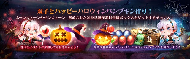 イベント期間中は、ゲーム内の各種イベントで入手できる様々なアイテムを集めて「ハッピーハロウィンパンプキン」を作ることができる。ハッピーハロウィンパンプキンからは、ムーンストーンやサンストーン、解放された装身具製作素材選択ボックスなどのアイテムを獲得できる。