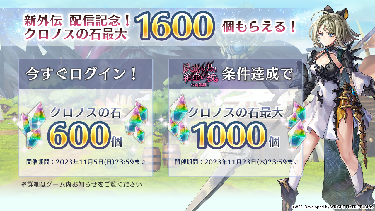 外伝「臥竜の島と絶崖の紋 伐竜姫譚Ⅰ」の配信を記念して、キャンペーン期間中に外伝「臥竜の島と絶崖の紋 伐竜姫譚Ⅰ」をクリアすると最大でクロノスの石1,000個が獲得できるキャンペーンを開催!