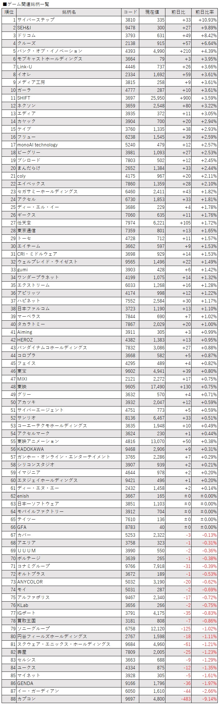 また、第2四半期決算が最終赤字となったドリコム<3793>がひとまず悪材料出尽くしとの見方から3日ぶりに反発し、バンク・オブ・イノベーション(BOI)<4393>やクルーズ<2138>、ネクソン<3659>なども買われた。