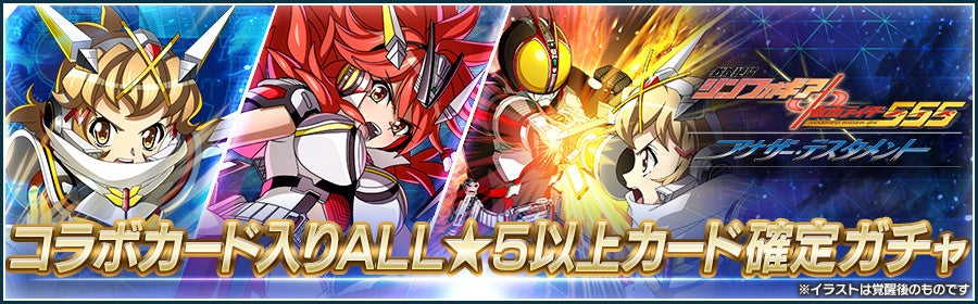『戦姫絶唱シンフォギア×仮面ライダー555 アナザー・テスタメント』イベント開催を記念して、1日1回歌唱石100個で引くことができる「戦姫絶唱シンフォギア×仮面ライダー555 アナザー・テスタメントイベントALL★5以上確定ガチャ」を開催いたします。
